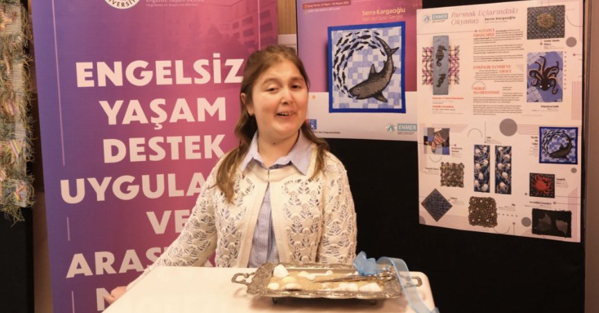 Üsküdar Üniversitesi Görme engelli Sosyal Hizmetler Programı öğrencisi Serra Kargaoğlu, ‘Parmak Uçlarındaki Okyanus’ adlı sergisinde ipliklerle oluşturduğu eserleri sergiledi. Denizaltından ilham aldığını belirten Kargaoğlu, “Dalgaların sesi benim için ritim gibi” dedi